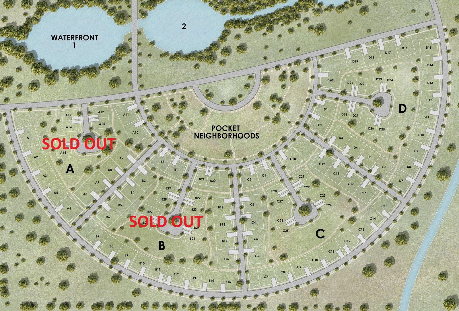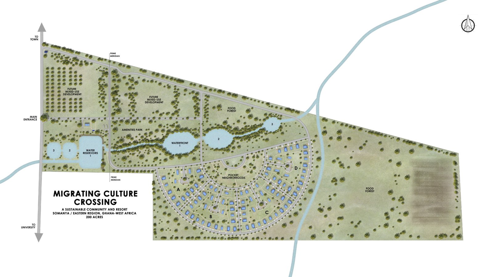 The development will include approximately 200 single and multi-family homes and apartments, a large organic food forest, a community center, scenic trails, outdoor recreation areas and other amenities. The community will be built over multiple phases. Below is an image showing our master plan. This may change as we analyze and assess the land more thoroughly, but it provides a basic view of the layout.